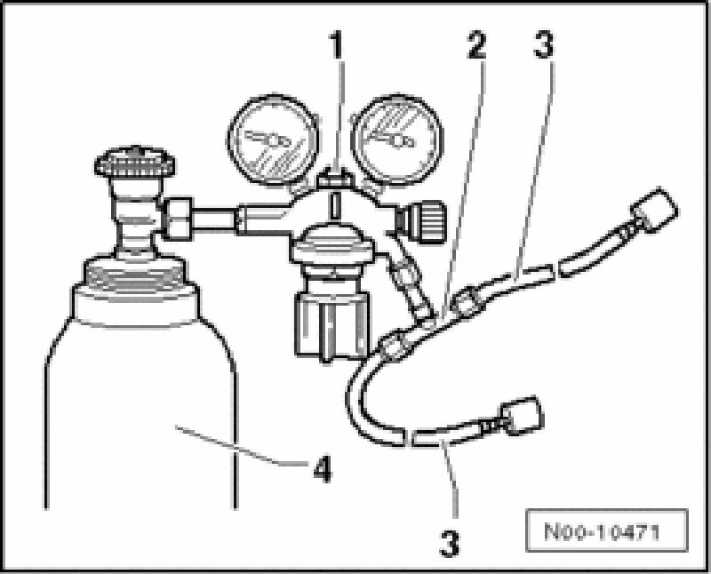 - Connect a nitrogen cylinder with manometer battery and pressure reducer (setting max. 15 bar) with suitable pressure hoses to the refrigerant circuit,.e.g. high pressure and lower pressure sides.