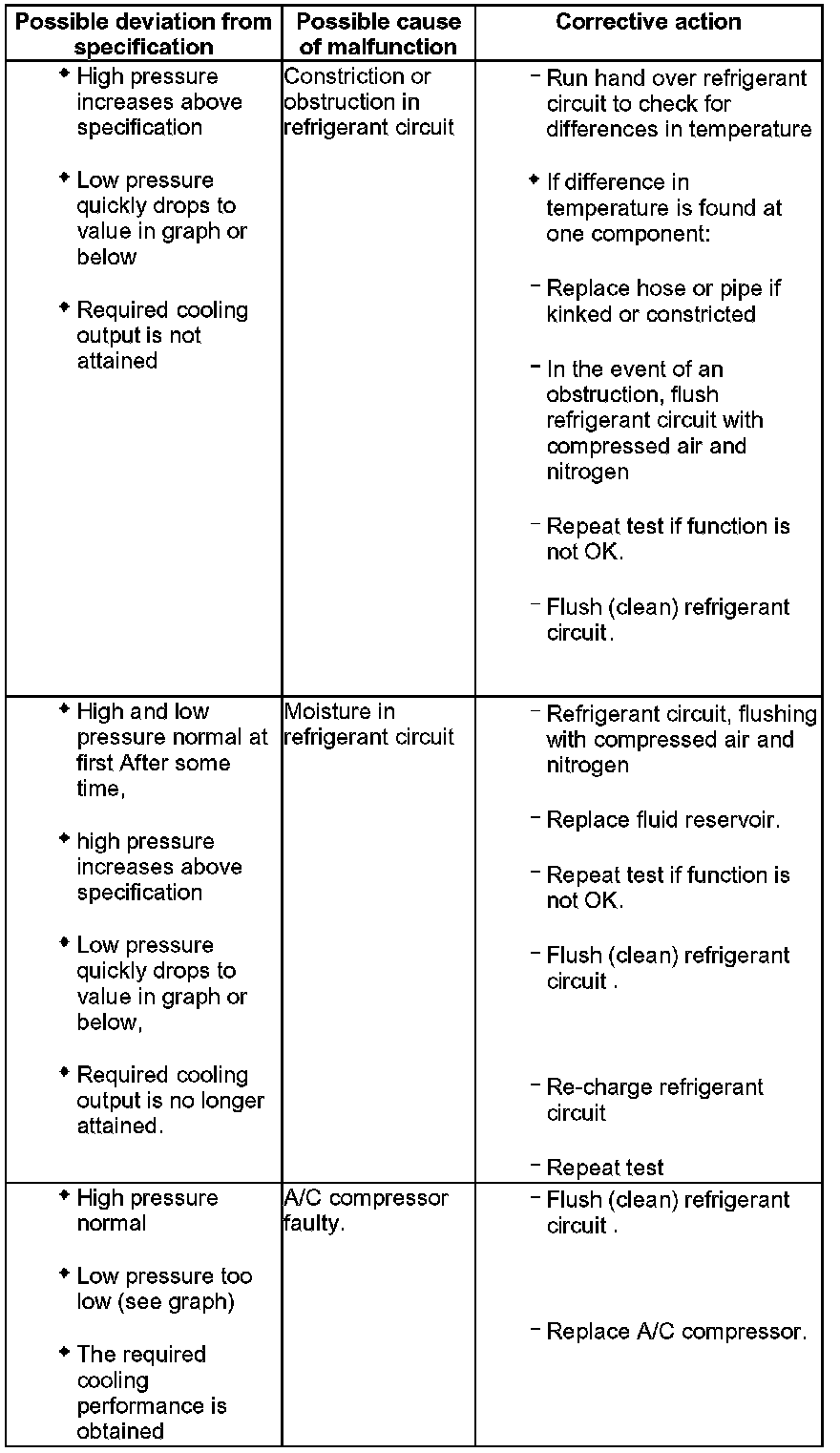 NOTE: If no malfunction is found with this complaint, flush (clean) refrigerant circuit with refrigerant R134a. If that is not possible in this workshop, flush refrigerant circuit with compressed air and remove moisture with nitrogen.