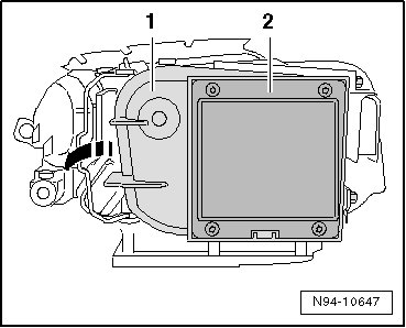 - Carefully insert ball head of headlamp beam adjustment motor - 1 - into ball head guide - 2 -, pull reflector toward rear while doing this.