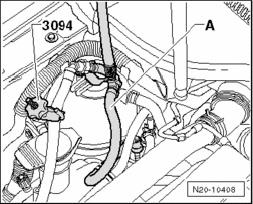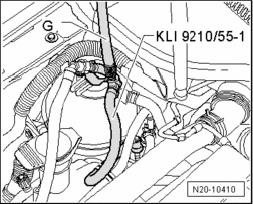 - Connect Adapter Hose KLI 9210/55-1 to ventilation line - A - between the purge valve and canister in engine compartment as shown.