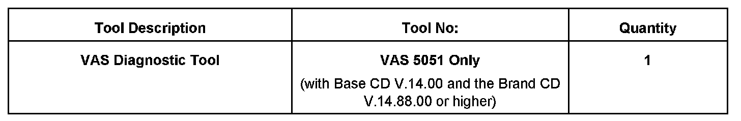 ^ VAS 5051 with Brand CD version 14.88.00 or higher. VAS 5052 may not be used as the scan tool. This is due to the need to have an external power source for the scan tool. A 110 V AC connection for the scan tool must be used as battery voltage is critical.