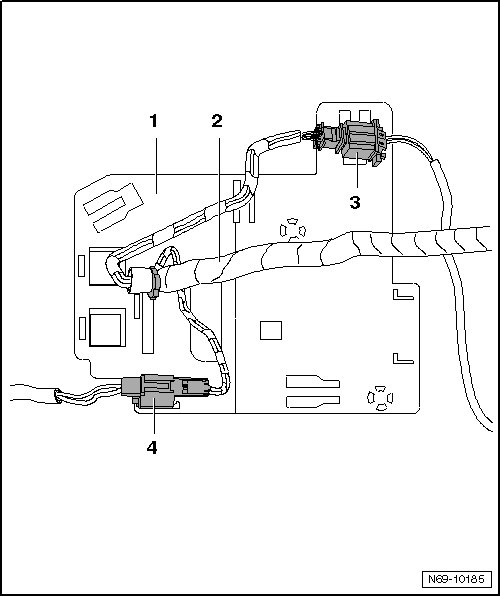 - Depending on vehicle equipment, operate locking mechanisms of individual harness connectors and disconnect the corresponding wiring harnesses from main wiring harness - 1 -.