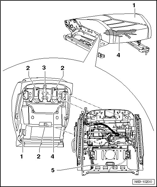 - Remove upholstery - 1 - and mat for seat occupied recognition - 4 - from seat frame.
