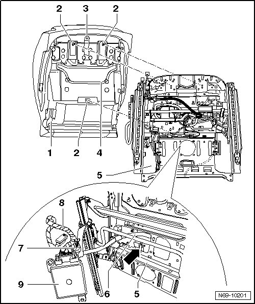 - Guide pressure hose - 6 -, Seat Occupied Recognition Pressure Sensor (G452)- 7 -, Seat Occupied Recognition Control Module (J706) - 9 - and wiring harness - 8 - - in direction of arrow - through hole in seat frame - 5 -.