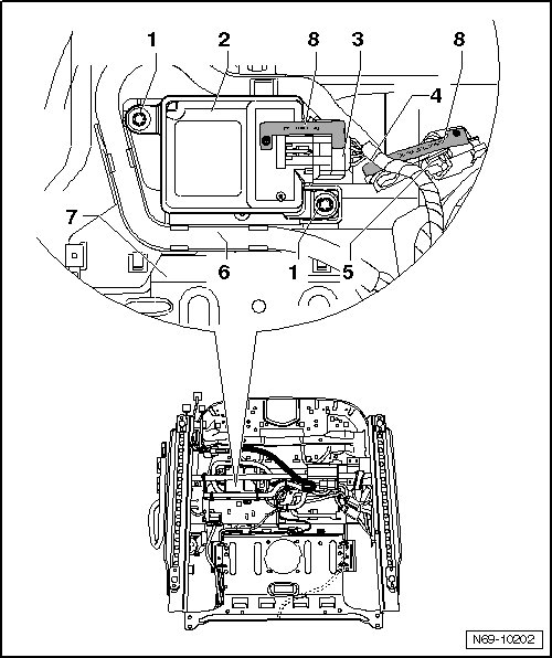 - Remove bolts - 1 - (2.5 Nm) and loosen Seat Occupied Recognition Control Module (J706).