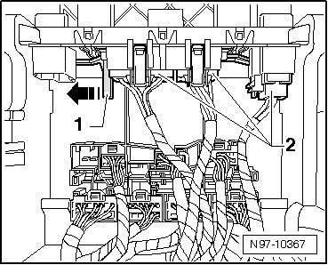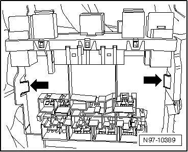 - Slide connector securing latch - 1 - of the relay carrier on the vehicle electrical system control module in the - direction of the arrow -.