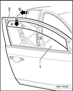 - Without using pressure, guide door window into clamping brackets - arrow a -.
