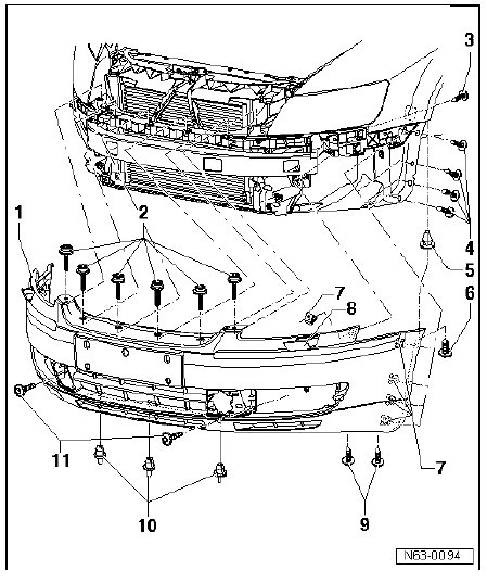 - Next, tighten bolts - 6 -, which point upward in the wheel housing, and bolts - 11 -.
