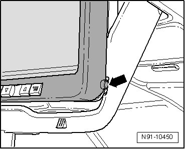 - Guide hook (VAS 3370) between monitor and cover in roof console and move it downward in - direction of arrow - until it contacts plastic monitor pins.