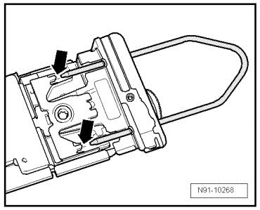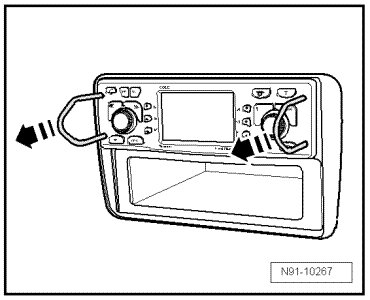 - Press locking mechanism on both sides of radio navigation system - arrow - and remove release bracket.
