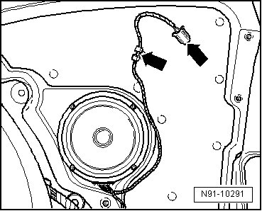 • When removing side trim, treble speaker may break away from trim due to a short wire connector from wire mount to speaker connector - arrows -. Therefore, carefully remove side trim.