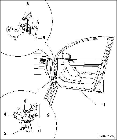 On vehicles through 01.2004, the eccentric pin bolt - 10 - must not be loosened and the eccentric pin - 15 - must not be used to adjust the door.