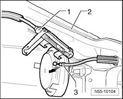 - Open hood release cable coupling - 1 - and remove hood release cable - 3 - in -direction of arrow - from hood release cable coupling.