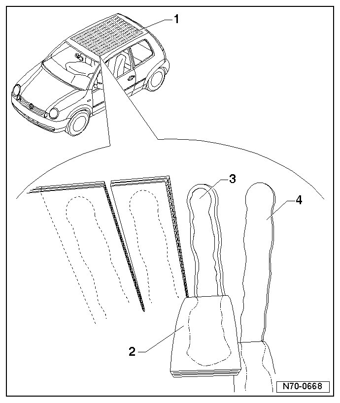 - Cut back adhesive residue - 3 - using electric cutter (V.A.G 1561 A) and cutting blade (V.A.G 1561/20) - 4 -.