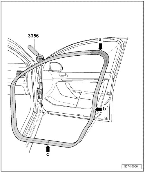- Remove cover film and apply seal in stages onto door in upper radius - arrow a -. Do not pull on the outer door seal so it will not be too long in the end.