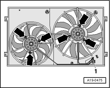 - Disconnect electrical harness connector - 1 - and remove the bolts for the fan shroud - arrows -.