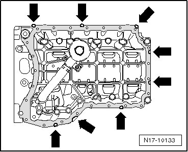- Press off lower section of oil pan at lift out pockets provided - arrows - on upper section of oil pan. Be careful not to damage sealing surfaces in the process.