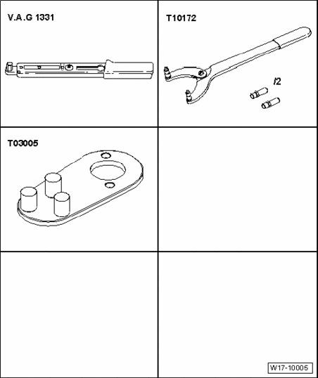 - Place oil pump fixture T03005 on to crankshaft pin and bolt it with 2 bolts - 1 - of vibration damper/belt pulley.