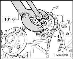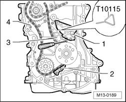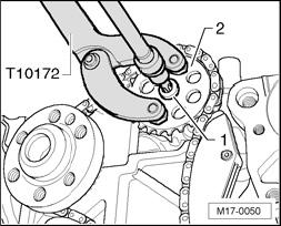 - Tension chain tensioner - 1 -, secure it using Locking Pin T10115 and remove it.
