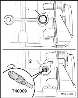 ^ Remove locking pin T40069 from cylinder block at rear and install plug (30 Nm).