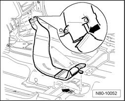- Lift floor carpet, unclip rear channel from floor and pull off from heating and ventilation unit -arrow-.