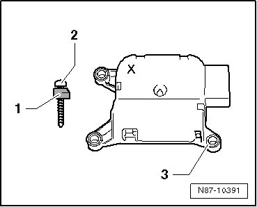 - Mount the new Temperature Regulator Door Motor ( V68) marked with an "X" using the shortened raised head screw - 2 - to the detached mount - 1 - to the bracket - 3 - on the blower case.