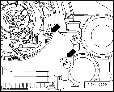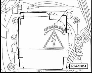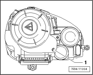 • To obtain access to the second headlamp beam adjusting motor bolts, an assembly opening made for this must be broken out on the rear side of the headlamp housing. This assembly opening must be sealed off with plugs (ordered separately) after completing the work.