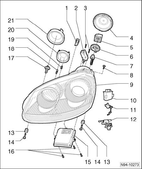 NOTE: For the first removal of Left Headlamp Beam Adjustment Motor V48 and Right Headlamp Beam Adjustment Motor V49 requires a repair set Parts Catalog (ETKA)