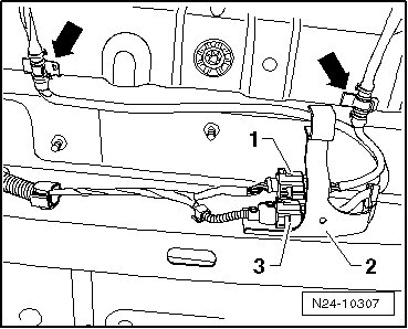 - Unclip wire - arrows -, pull off bracket - 2 - and disconnect connectors - 1 - for O2S behind TWC and - 3 - for O2S in center TWC, Bank 1 (G465).