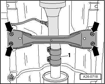 - Loosen the bolts for the clamp - 1 -. The front crossmember nuts - arrows - for the vehicle floor must NOT be removed.