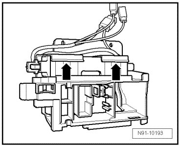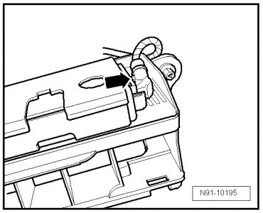 - Fold both latches on plastic bracket in direction of - arrow - and remove telephone operating electronics control module.