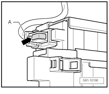 - Release connector by pressing on catch spring - A - and swing bracket in direction of - arrow -.