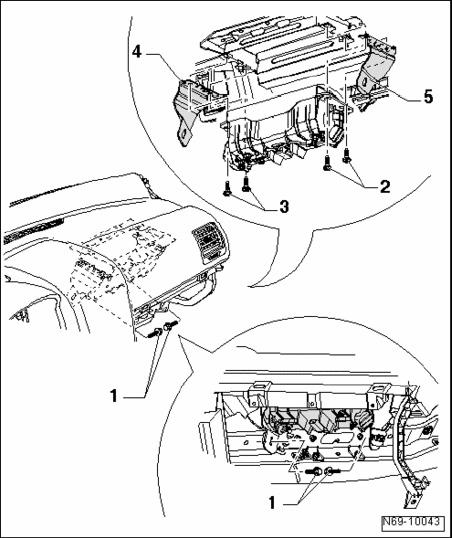 - If a passenger airbag housing cosists of plastic, screws - 2 - and - 3 - (9 Nm) should be inserted with locking compound D 197 300 A1.