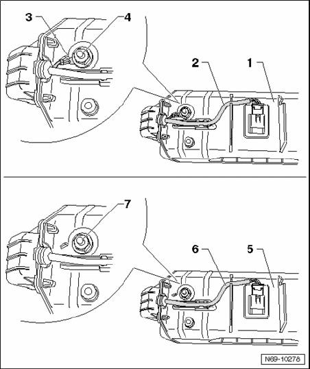 - With a passenger airbag without ground line - 5 -, the wiring harness - 6 - is a two-connector harness and no additional cable is secured on the threaded pins - 7 -.