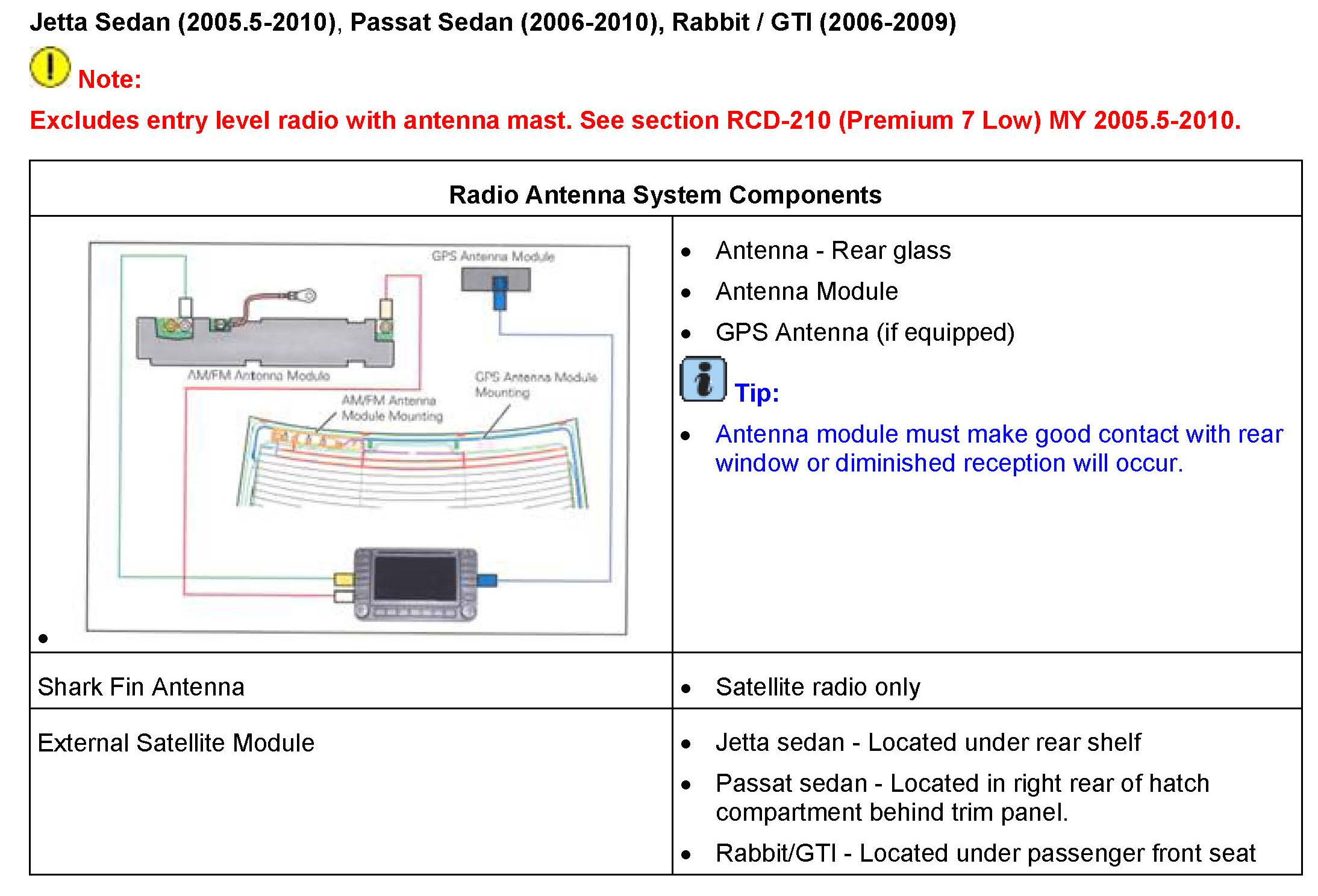 ^ Radios with internal satellite receiver: Is a message displayed on screen stating Satellite radio not available"? This indicates a radio concern. Swapping a known good similar radio is an easy check to confirm the radio is the problem. Applies to RNS-510, RNS-315, RCD-510, RCD-310 (with sat).