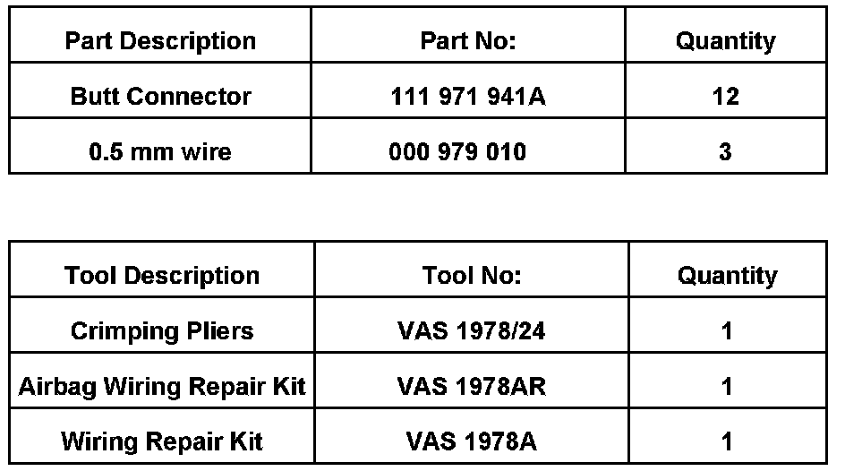 ^ Using butt splice crimping tool VAS 1978/24: Splice the harness together using three 4 in. sections of Repair wire Part No: 000 979 010 (from VAS 1978AR wiring repair kit) and 6 butt connectors Part No: 111 971 941A harness repair kit 1978.