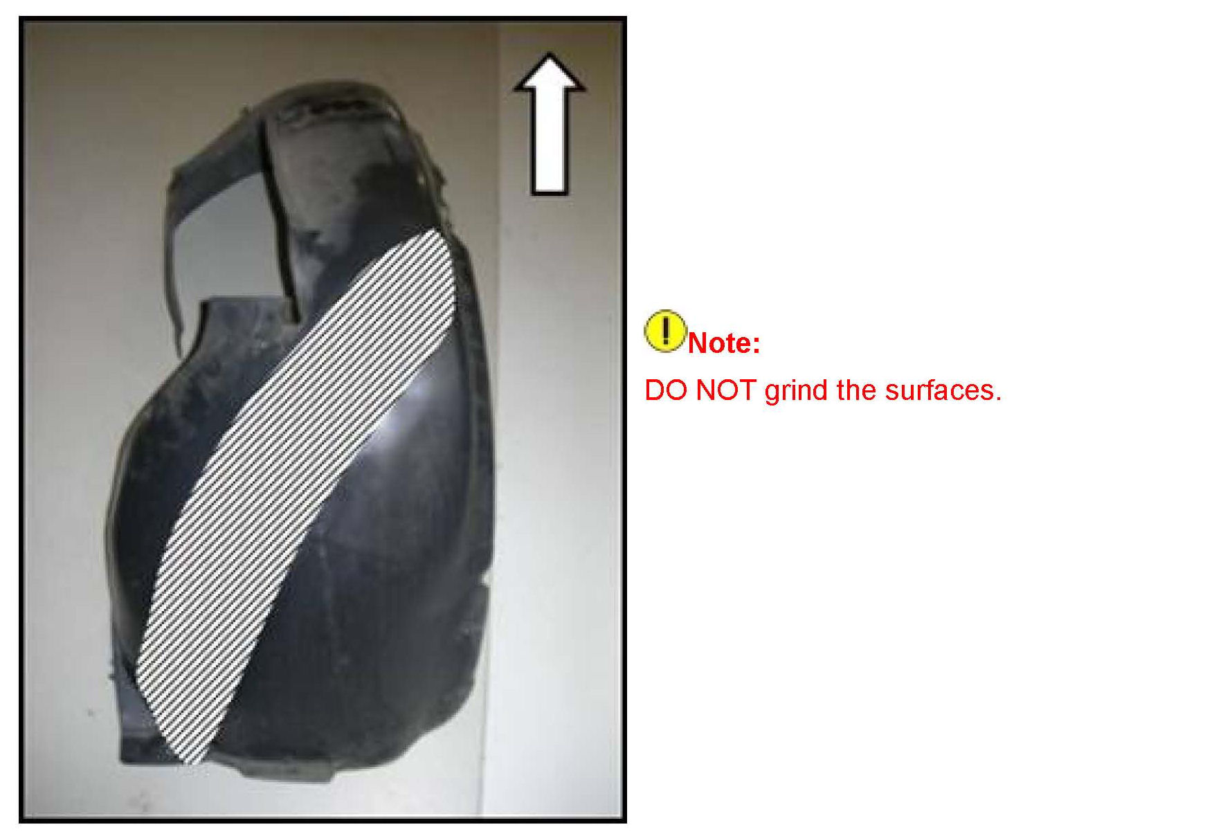 ^ Clean Front Wheel Housing Liner(s) in outlined area with soap and water mixture, and then with 3M(R) General Purpose Adhesive Cleaner, Part No. 08987.