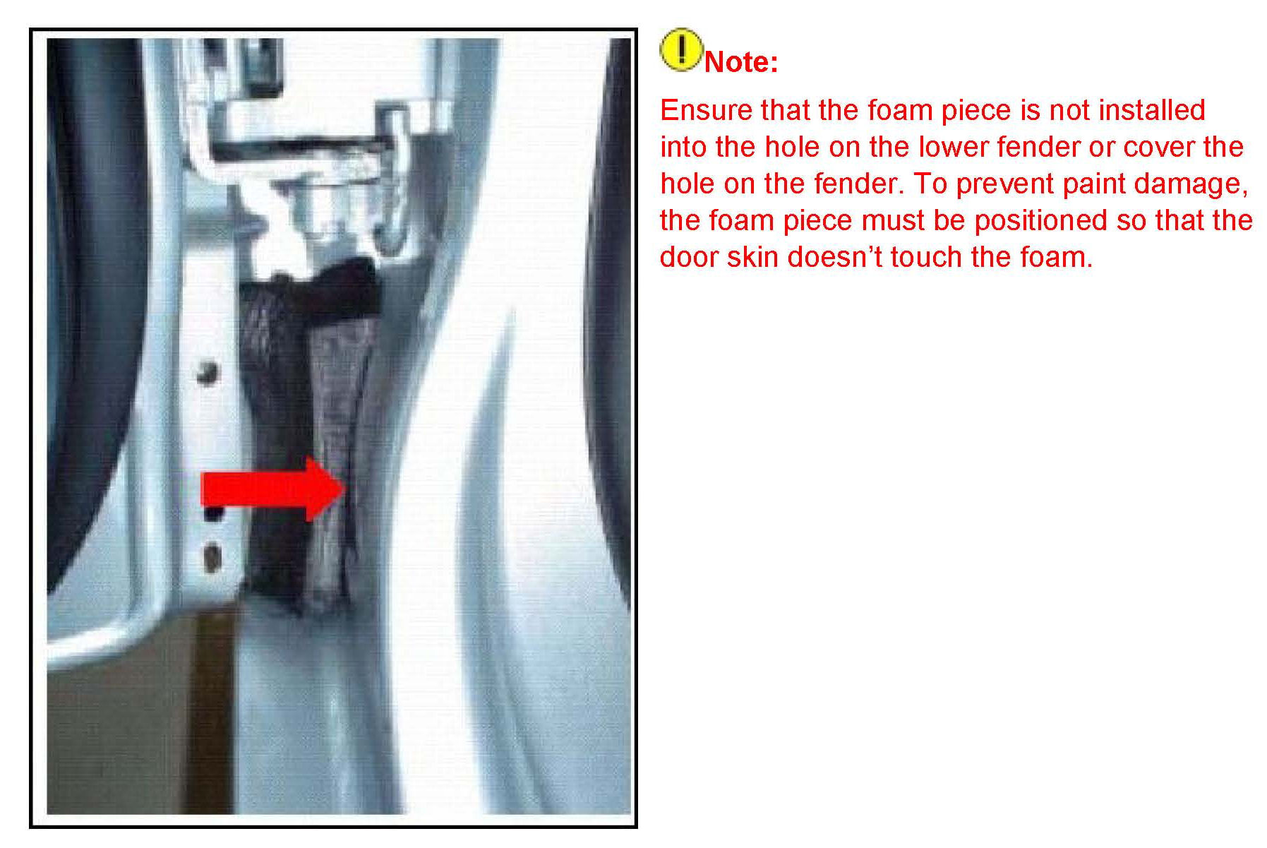 Perform the following counter-measures to prevent thawing water from getting to critical areas behind door, but allow the thawed water to drip on Front Wheel Housing Liner, from where it can flow away.