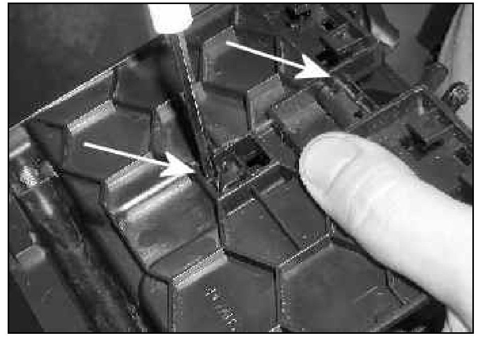 - Using a small screw driver as necessary, release both cover locking tabs -arrows-, and remove cover.