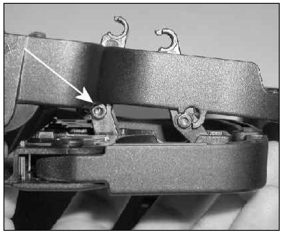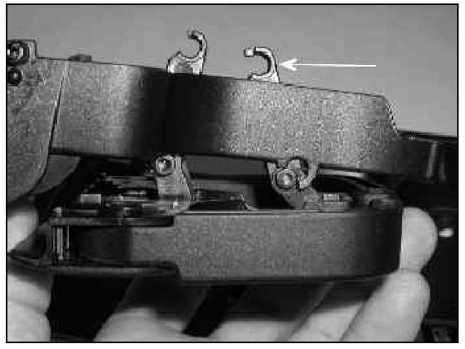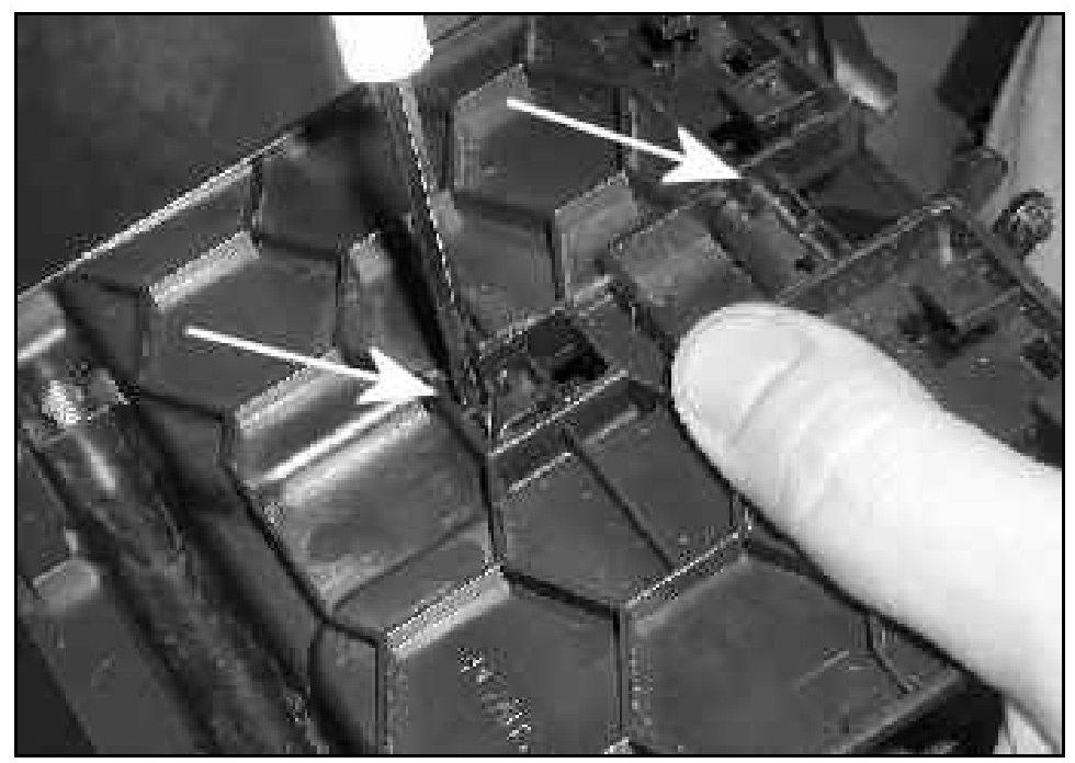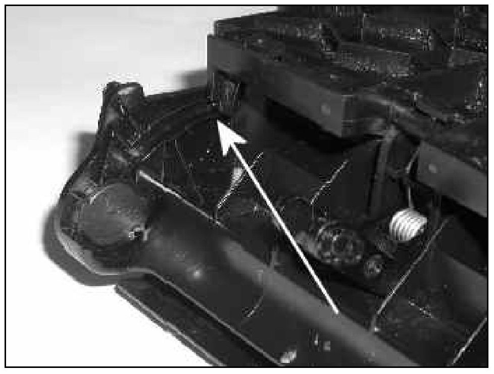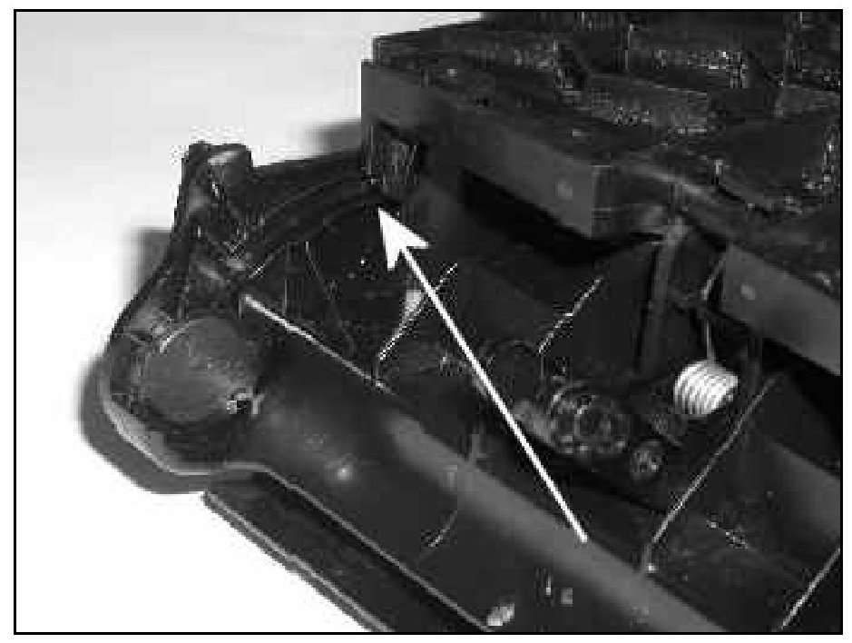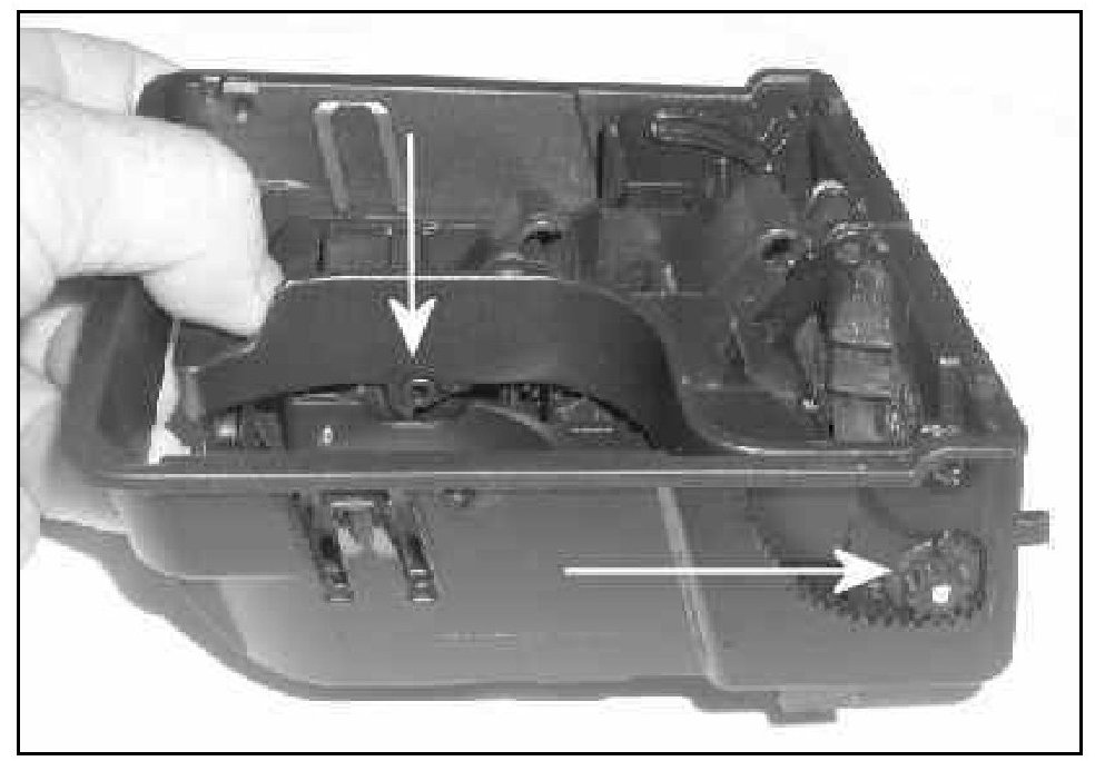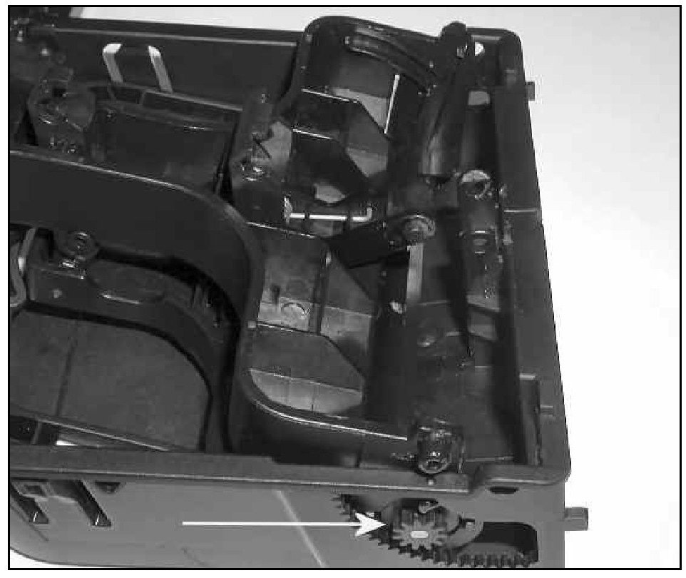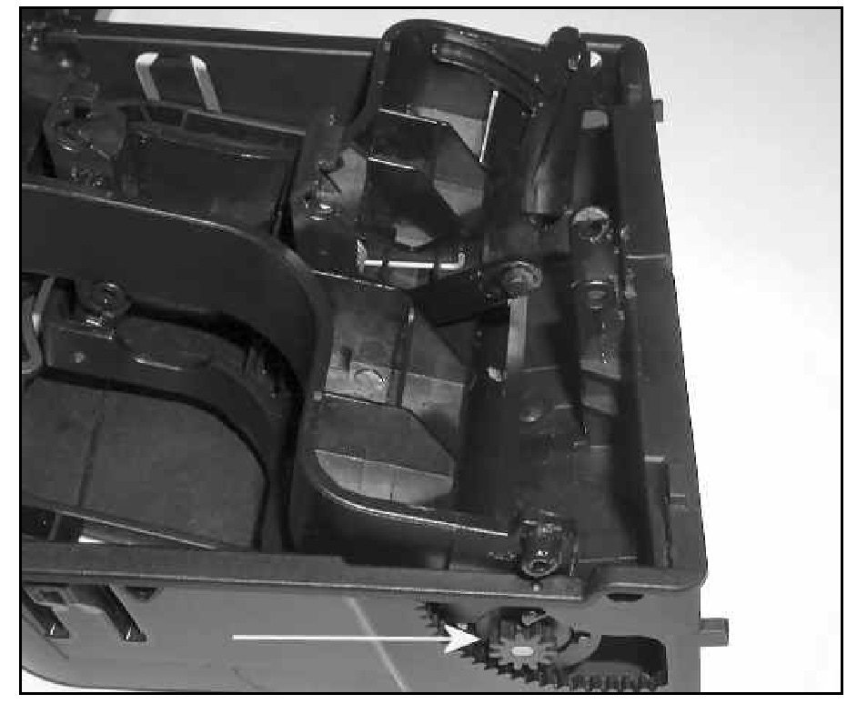 Tip: Upon disassembly the tray gear -arrow- may pop out of place and fall into the tray. If this occurs, snap gear back on to tray support.