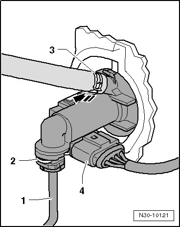 - Press the hose/line assembly - 1 - and seal - 2 - into the clutch master cylinder connection - 4 - until the clip - 3 - clicks into place.