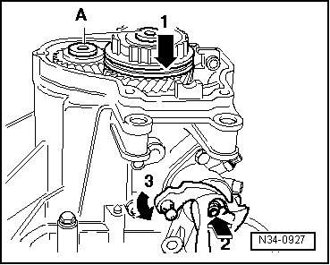 - Engage 5th gear - arrow 1 - and 1st gear - arrows 2 and 3 - and then tighten the bolts - A - for the synchronizing hub with operating sleeve and the 5th gear to specification. See - item 4 - in => [ Transmission Housing and 5th Gear Cover ] Transmission Component Overviews.