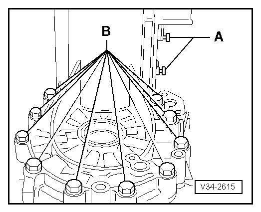 - Remove the support pins - A - from the top side of the transmission and remove the bolts - B - for the transmission housing to clutch housing in the area of the differential.