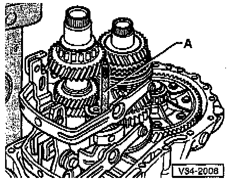 - Remove the 5th gear synchronizing hub with operating sleeve, the 5th gear and the transmission housing by tightening the spindles - A - - (approximately 1/2 turn).