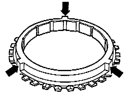 The notches - arrow 3 - on the synchronizer hub must line up with the cast locking pieces on the synchronizer ring (lower).