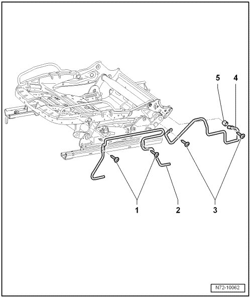 - Remove two bolts - 3 - (3.5 Nm) and remove bracket - 4 - and spacer pipe - 5 - from seat frame.