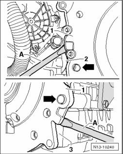 - Press off control housing cover - 1 - from cylinder block - 2 - or from upper section of oil pan - 3 - at the positions designated at top and bottom using a suitable screwdriver - A -.