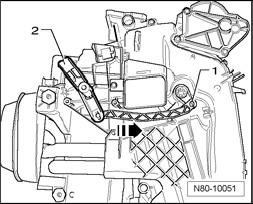 - Disengage locking mechanism -1- and press adjusting unit for temperature flap in direction of -arrow- until it reaches stop.