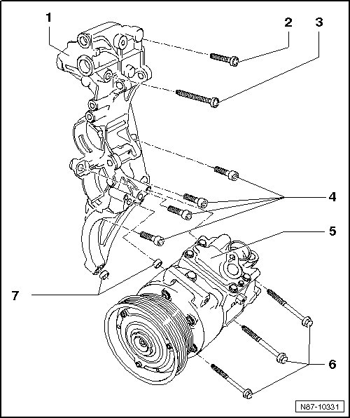 - Loosen A/C compressor, unscrew hex-bolts - 6 -. Remove A/C compressor from auxiliary component bracket and secure to body with appropriate material (e.g. welding wire) => [ Securing A/C compressor to body ]