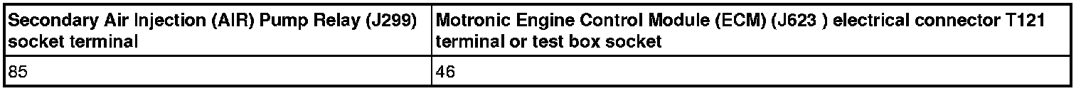 - Using a Multimeter, check the Motronic Engine Control Module (ECM) Power Supply Relay (J271) socket 85 to the Secondary Air Injection (AIR) Pump Relay (-J299- ) socket 85 for voltage.